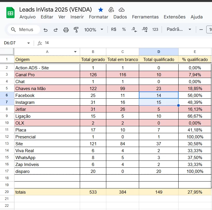 Medimos a taxa de qualificação por canal (Facebook 56%, Instagram 48%, Site 30,95%, OLX 0%).